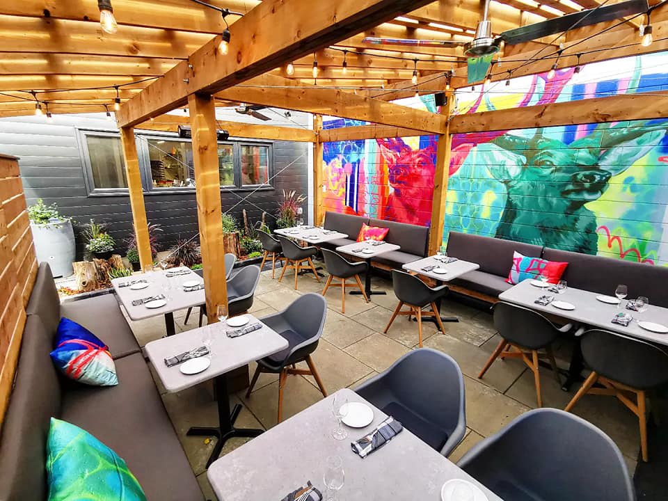 We have a beautiful covered interlock patio, complete with a lovely garden, heaters, warm lighting that features a gorgeous, edgy and colourful mural by the insanely talented artist: Francis Pratt. You can even sneak a glimpse into our beautiful new kitchen from here.