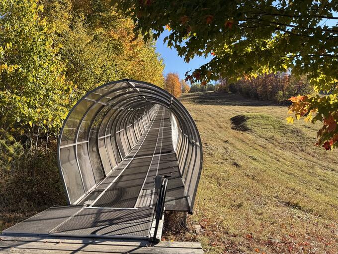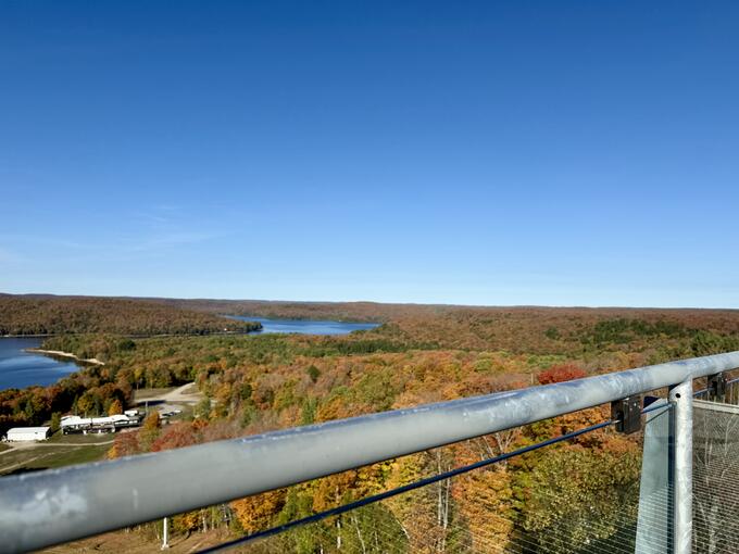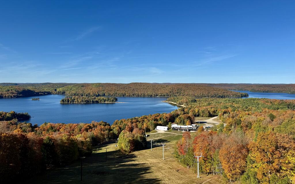 Before checking in, we detoured to Sir Sam’s Ski & Ride. The covered carpet lift carried us slowly up the slope to the Eagle View Observation Tower, where we climbed to the top and stood surrounded by a sea of colour. The view stretched endlessly across Eagle Lake and the surrounding forests, the kind of panorama that makes you pause without meaning to.