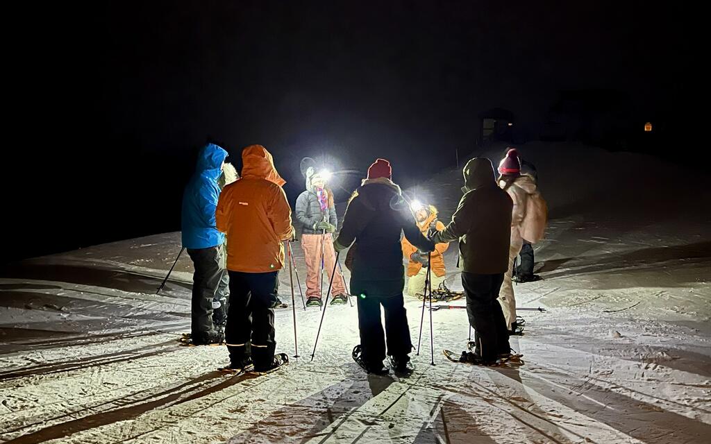 The trek from the cabin to the base was fairly easy and took about 40 minutes to complete. There are a couple of steep parts along the way, but the snowshoes and poles provided by the team helped us keep our balance and feel totally secure. We were incredibly lucky that evening as it was a full moon, which added to the magic and lit the way so brightly that we could see the trail even without our headlamps!